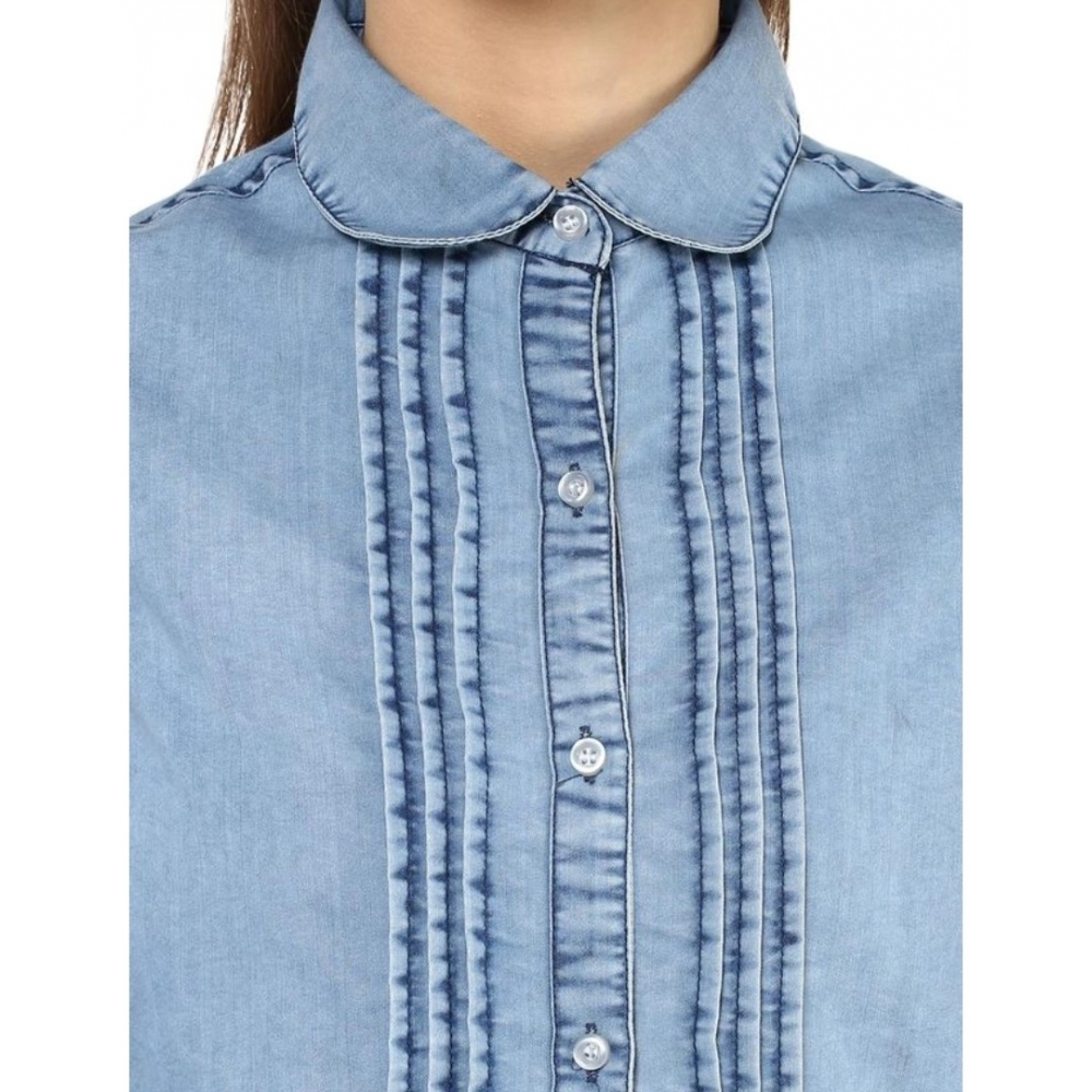 Generic Women’s Denim Solid 3-4th Sleeves Standard Length Shirt (Blue)