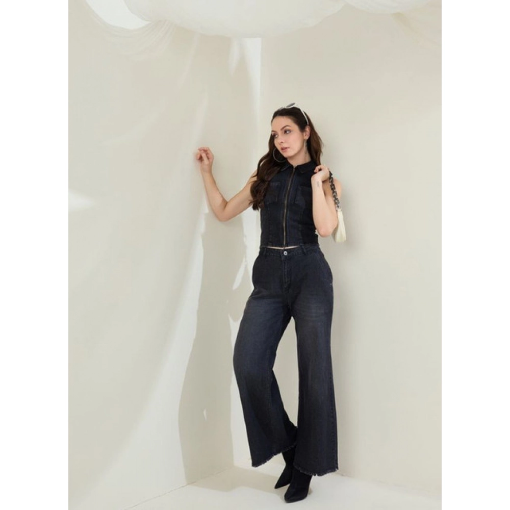 Generic Women’s Denim Lycra Solid Sleeveless Top (Black)